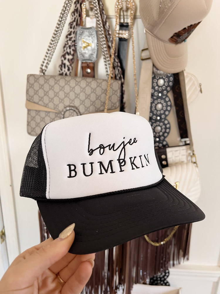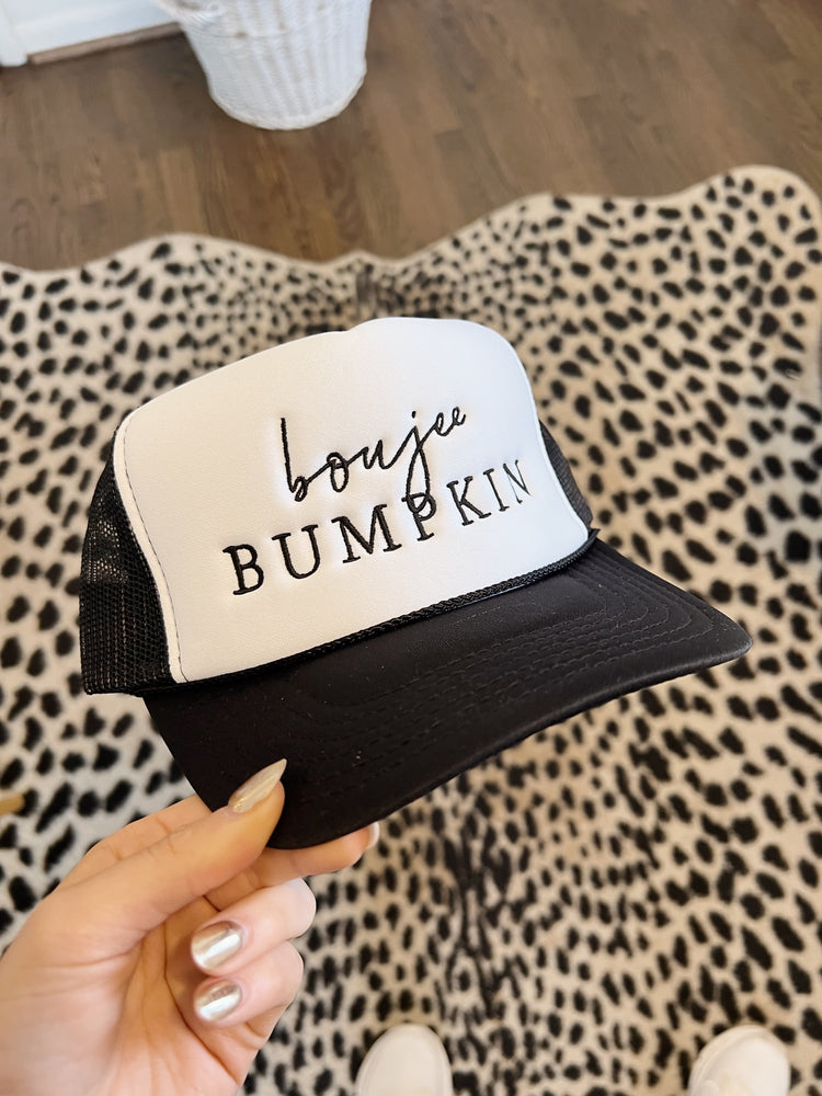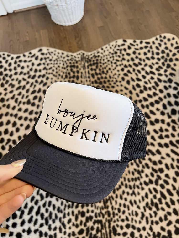 Black and white foam trucker with black thread embroidered on the front. Plastic snap closure.