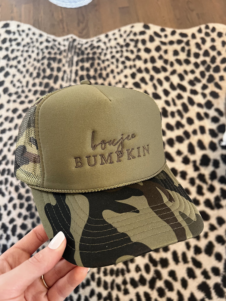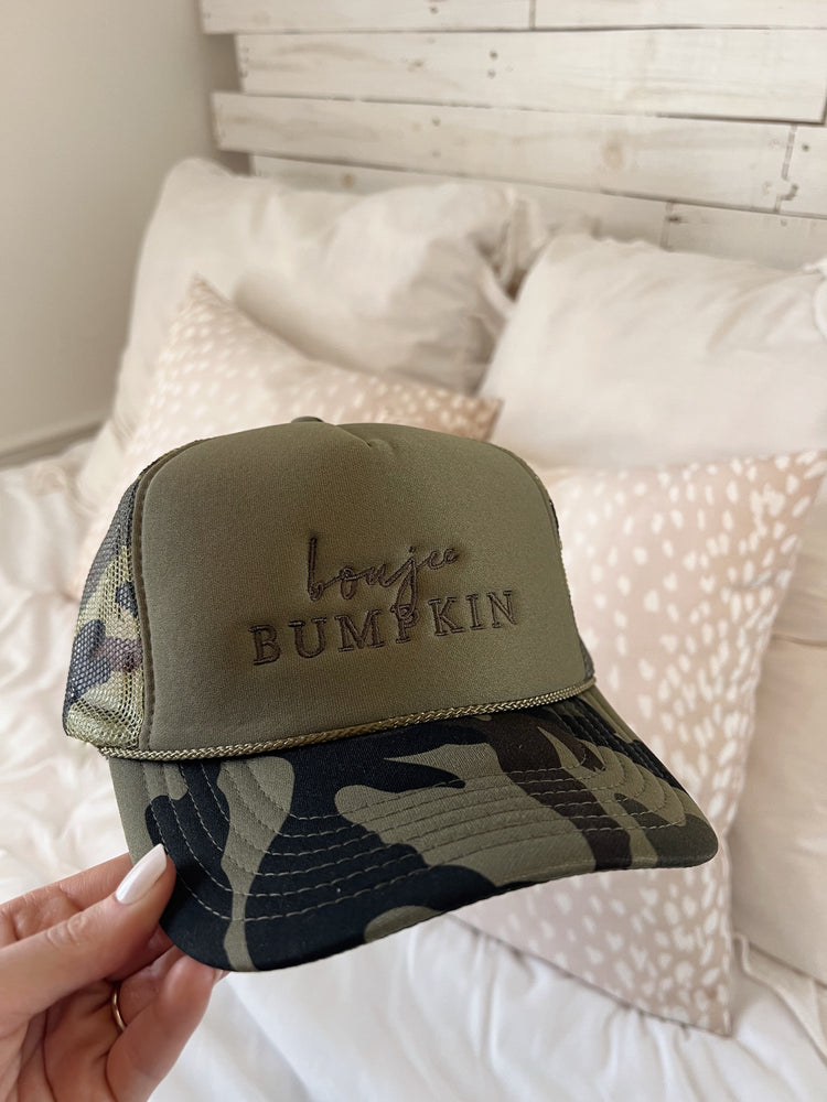 Camo and dark OG green foam trucker with brown thread embroidered on the front. Plastic snap closure.
