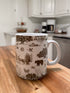 A stoneware 20 oz mug displaying a full wrap-around design. Our Brown Toile mug is conveniently microwave, oven, dishwasher, and food safe for easy use.