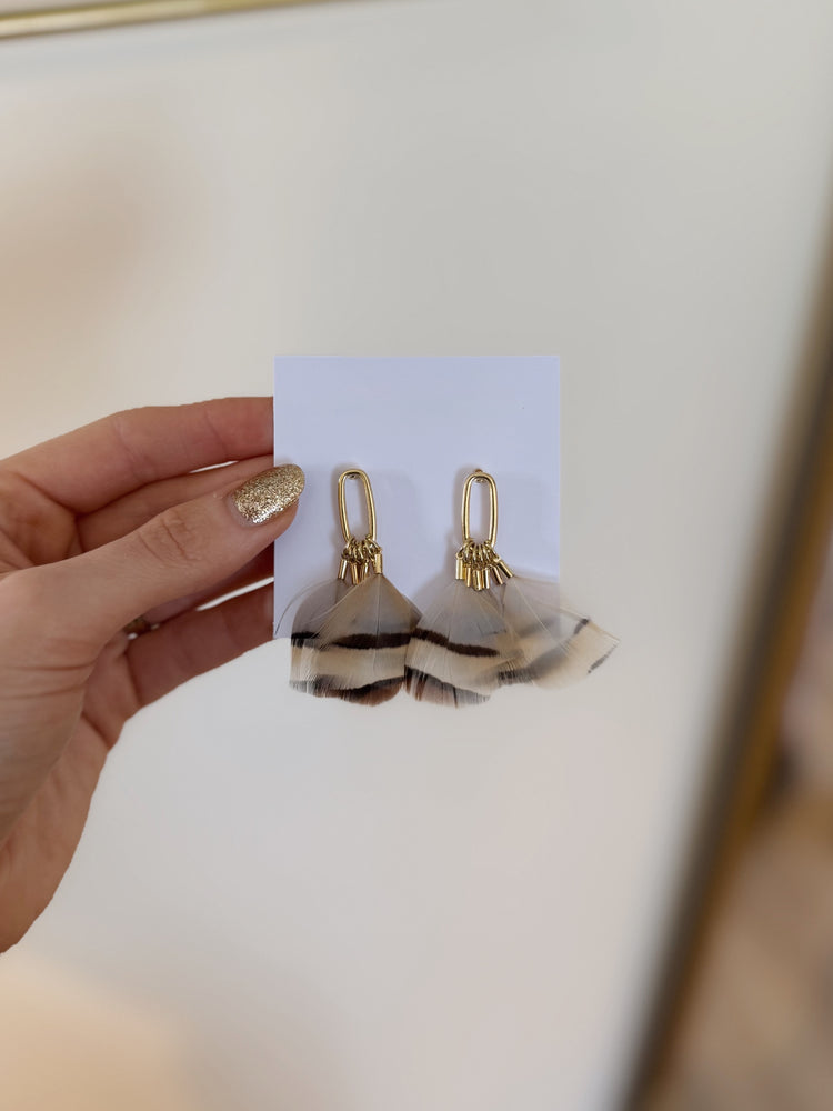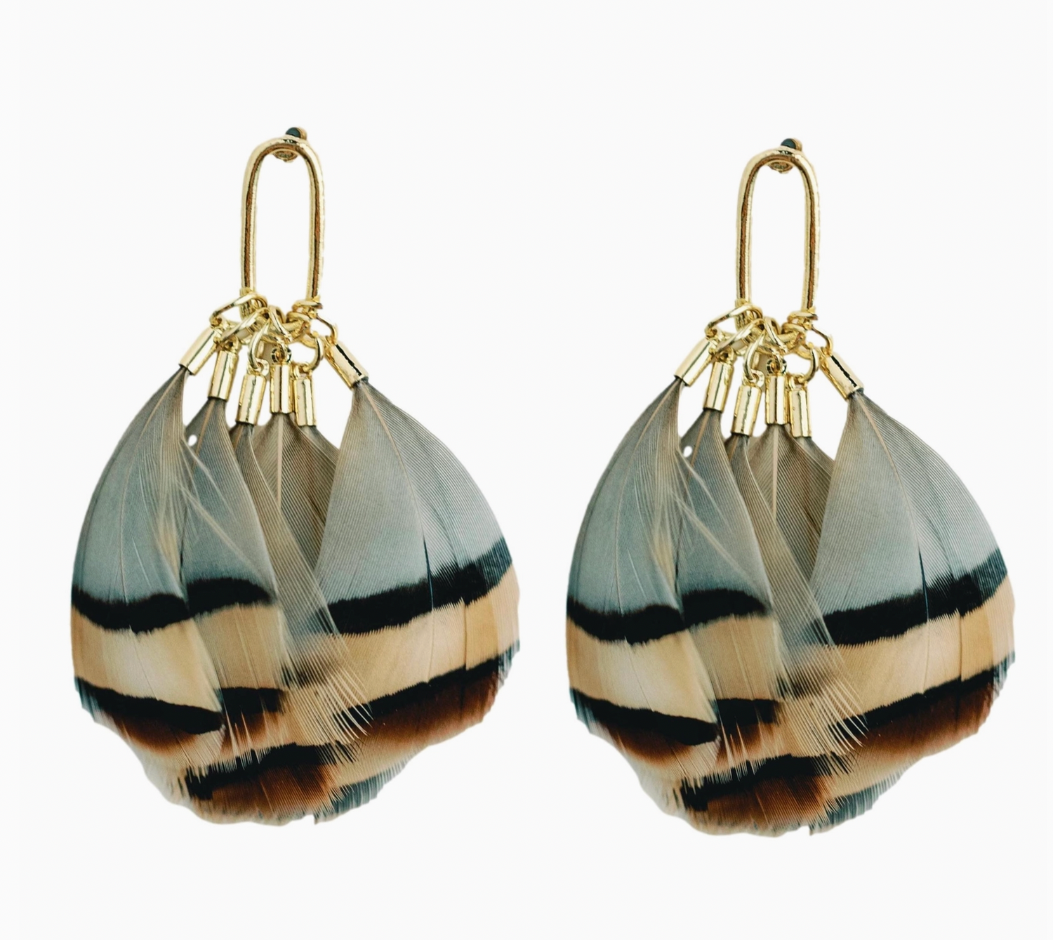 These adorable feathered statement earrings are practically weightless yet pack an impressive punch of fashion-forward flair! The brown and cream striped feathers, which effortlessly match with a variety of colors, add a touch of sophistication.