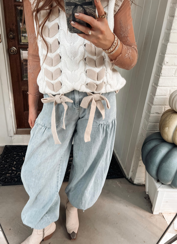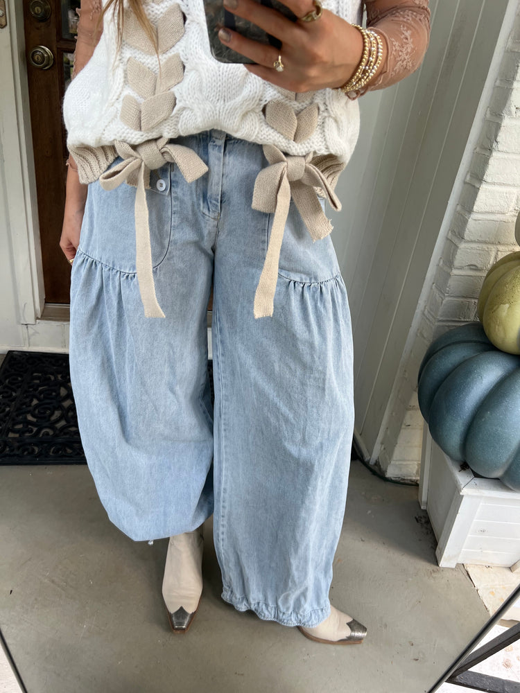 Washed denim wide leg pants that double as cinched hem tie detail jeans