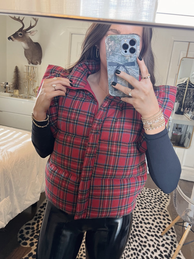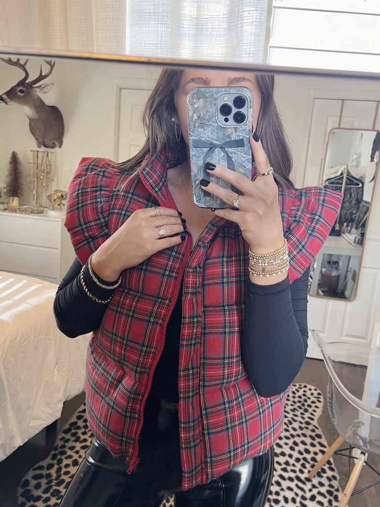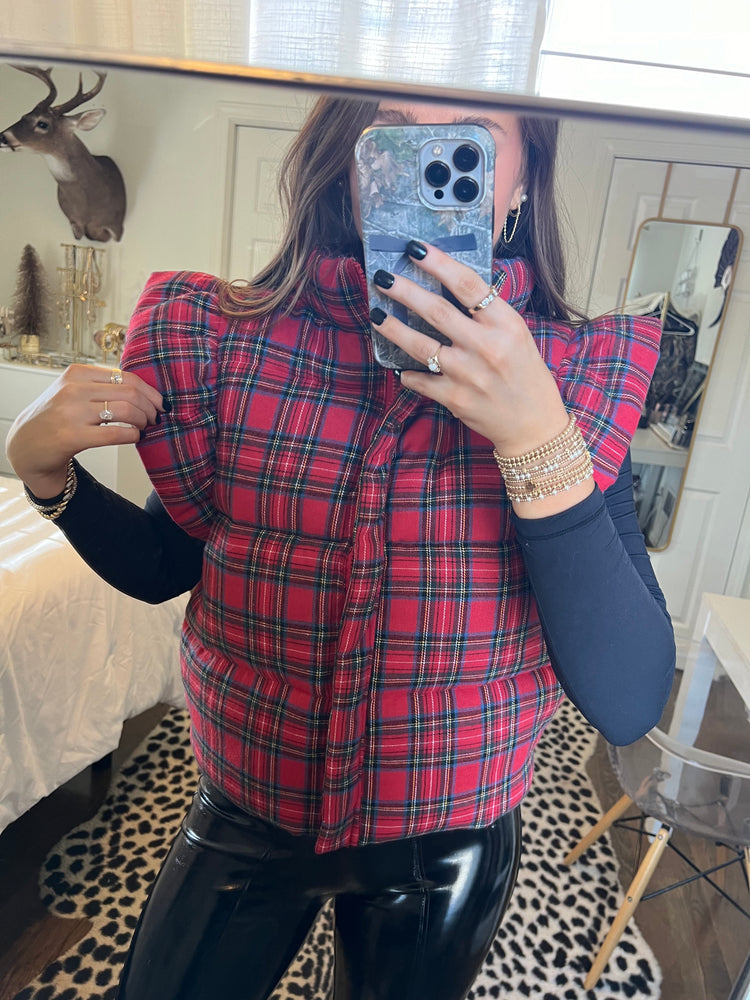 Plaid puffer vest with ruffle sleeves